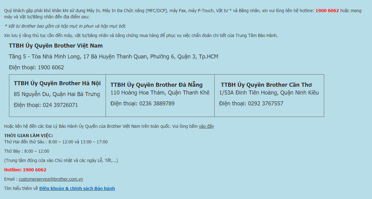 Quý khách gặp phải khó khăn khi sử dụng Máy In, Máy In Đa Chức năng (MFC/DCP), máy Fax, máy P-Touch, Vật tư * và Băng nhãn, xin vui lòng liên hệ hotline: 1900 6062 hoặc mang máy và Vật tư/Băng nhãn đến địa điểm sau: