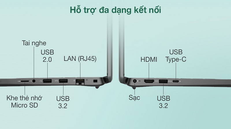 Ngoài ra, Laptop Dell Latitude 3520 còn được trang bị đầy đủ các cổng kết nối thông dụng 2 x USB 3.2, Jack tai nghe 3.5 mm, HDMI, LAN (RJ45), USB 2.0, USB Type-C, khe đọc thẻ nhớ Micro SD và hai chuẩn kết nối không Wi-Fi 6 (802.11ax), Bluetooth 5.1 cũng được hỗ trợ nhằm đảm bảo kết nối chặt chẽ với các thiết bị ngoại vi và duy trì ổn định tốc độ kết nối internet, tránh bị gián đoạn khi làm việc.