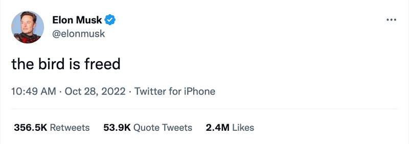 the bird is freed”, Elon Musk chính thức trở thành chủ sở hữu kiêm Giám đốc điều hành duy nhất của Twitter cho đến nay.