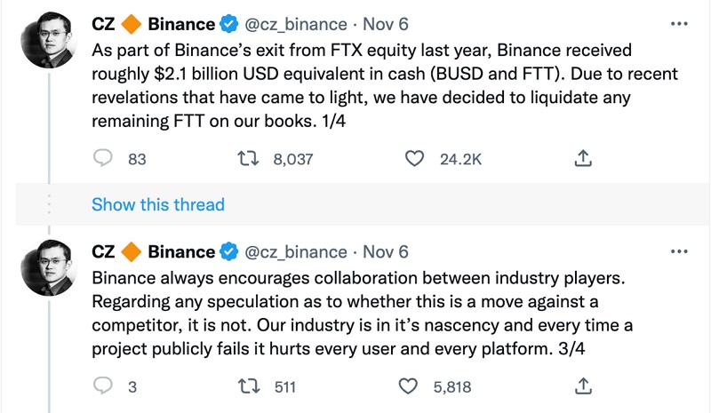 Là một phần trong kế hoạch rút vốn chủ sở hữu FTC vào năm ngoái, Binance nhận được khoảng 2,1 tỷ USD bằng tiền mặt (BUSD và FTT). Do những thông tin gần đây, chúng tôi đã quyết định thanh lý mọi FTT còn lại mà chúng tôi còn sở hữu”. Dòng tweet này là khởi đầu cho