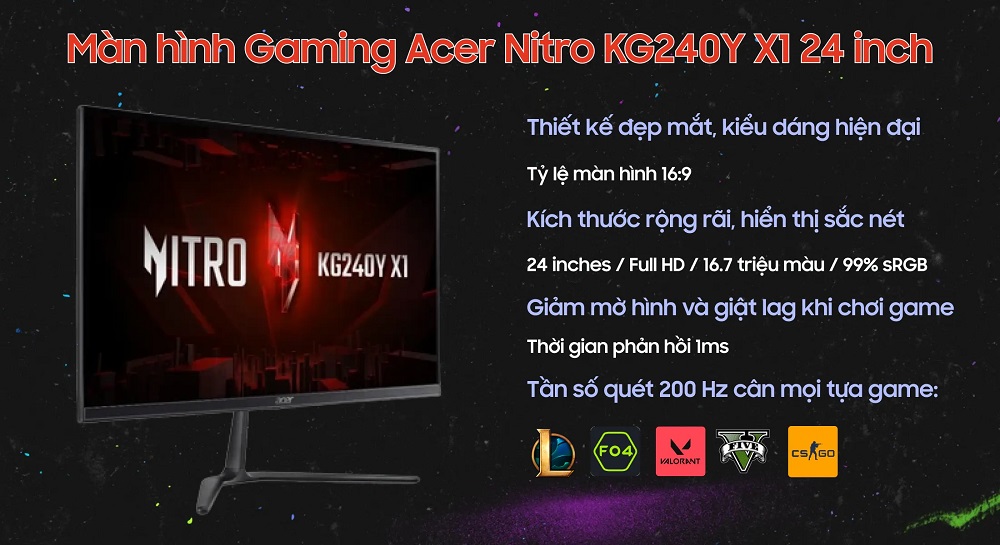 Trong nhóm màn hình 24 inch 200Hz, hiện có nhiều thương hiệu tham gia như Acer, LG, Asus, MSI. Tuy nhiên, xét về cân bằng giữa giá cả và thông số, Acer Nitro KG240Y X1 được xem là một trong những mẫu nổi bật: