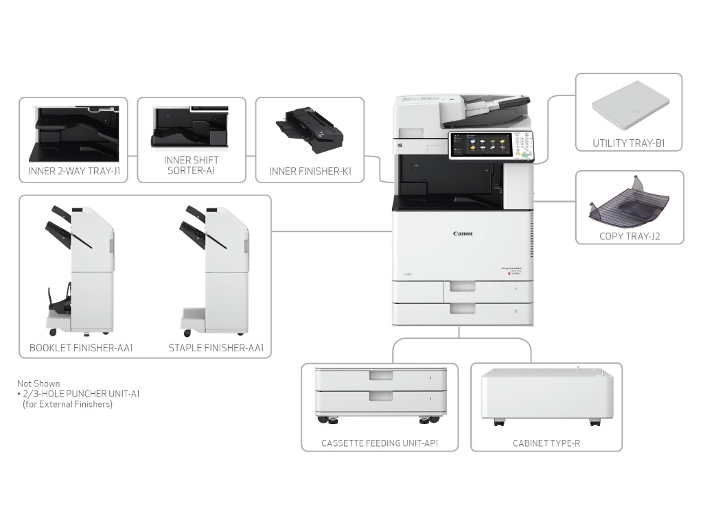Khổ giấy sử dụng tối đa: A3. Bộ nhớ tiêu chuẩn: 3GB - 250GB HDD