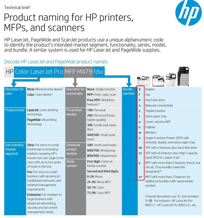 Các bạn có thể tham khảo thêm trong hình để nắm rõ hơn về ý nghĩa các hậu tố trong tên máy in HP nhé.